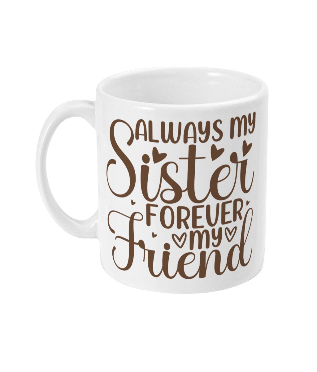 Indulge in the sisterly bond with our ‘Sisterly Sentiments’ Mug. Emblazoned with ‘Always my Sister Forever my Friend’ in an elegant brown font, this white ceramic mug encapsulates the eternal connection between sisters. Whether a birthday treat, holiday surprise, or a daily affection, this mug symbolises the enduring love, laughter, and support that defines sisterhood.
