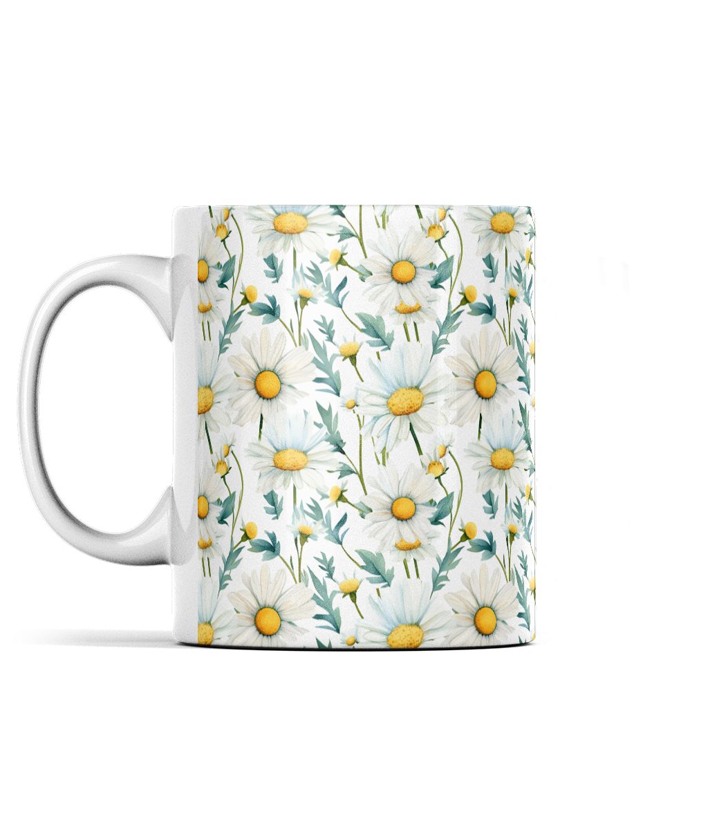 Indulge in the serene beauty of nature with our Serenity Blooms Watercolour Daisy Mug. This elegant white ceramic mug is adorned with a delicate watercolour daisy pattern in white, featuring sunny yellow centers and lush green leaves. Perfect for those who appreciate the simple beauty of blooming daisies, this mug is a versatile piece of art ideal for daily use or gifting to someone special.