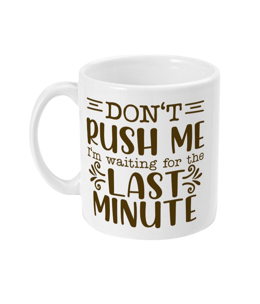 Indulge in the charm of creative procrastination with our Last Minute Magic Mug. Crafted from durable ceramic in a pure white hue, this mug features the humorous phrase, ‘DON’T RUSH ME I’m waiting for the LAST MINUTE’ in playful typography. Whether you’re a deadline dancer or know someone who thrives on last-minute magic, this mug is the perfect blend of functionality and fun. Dishwasher and microwave safe, it’s an ideal gift for those who appreciate the beauty of embracing a creative process even at the eleventh hour.