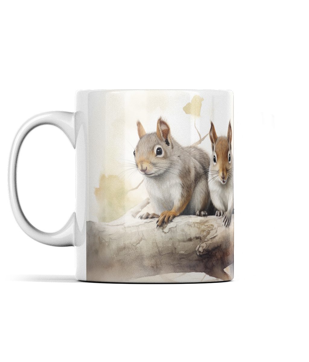 Step into the enchanting world of nature with our Grey Squirrel Family Watercolours Mug. This ceramic mug showcases a lifelike illustration of two squirrels perched on a branch, surrounded by delicate leaf designs. Perfect for animal lovers and those who appreciate the beauty of the forest, this mug is a delightful gift that brings a touch of woodland magic to every sip. Whether starting your day or unwinding in the evening, let this mug transport you to a serene forest setting, making your tea or coffee moments truly special.