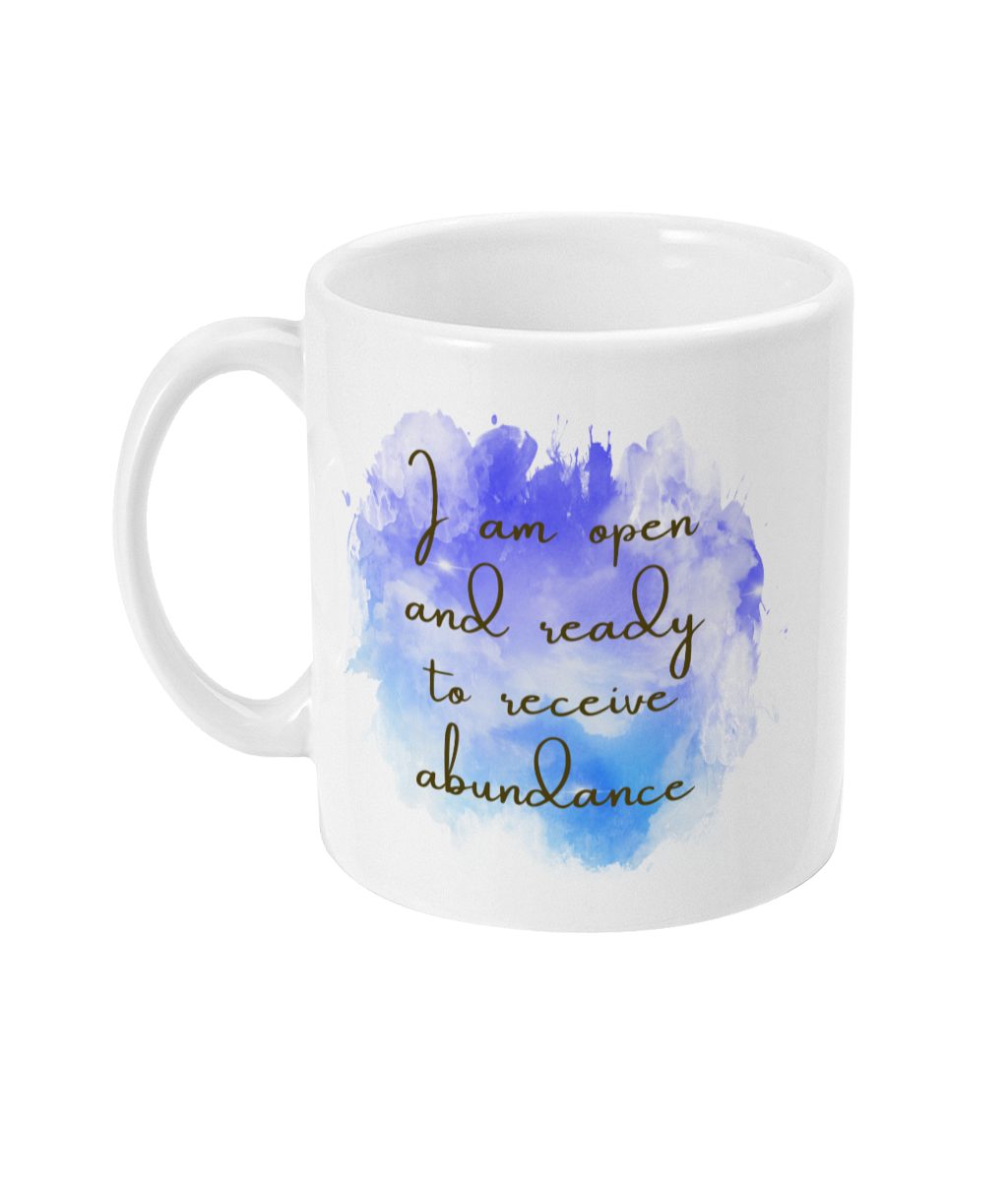 Elevate your mornings with our captivating Embrace Abundance Mug. Made in the UK, this white ceramic mug showcases a beautiful watercolor-style design in serene blue and purple hues. Adorned with the empowering affirmation ‘I am open and ready to receive abundance’ in elegant cursive script, this mug is a perfect gift to uplift and inspire those dear to you.