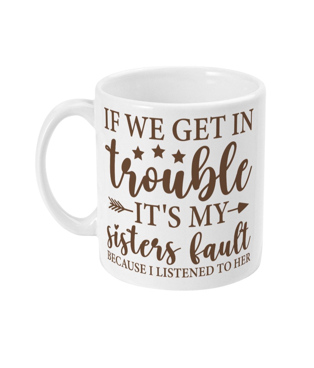 Experience the essence of sibling bonds with our Sister Shenanigans Mug. This white ceramic mug features a playful message in brown and gold text, surrounded by charming stars and an arrow, encapsulating the blame, laughter, and love unique to sibling relationships. Perfect for reflecting on shared memories over a coffee or hot chocolate, this mug makes an ideal gift for anyone who cherishes the joys and jests of sisterhood.