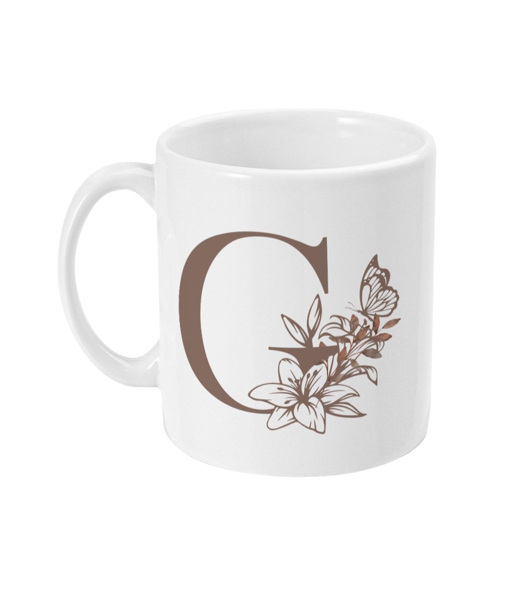 Elevate your sipping experience with our Botanical Elegance Initial G Mug. Crafted from ceramic, this white mug boasts a graceful floral design showcasing the letter ‘G’ intertwined with delicate blooms and a whimsical butterfly. Perfect for those who appreciate artistry in everyday objects, this mug combines functionality with aesthetic beauty, making it an ideal gift for nature lovers or anyone seeking a touch of sophistication in their morning routine.