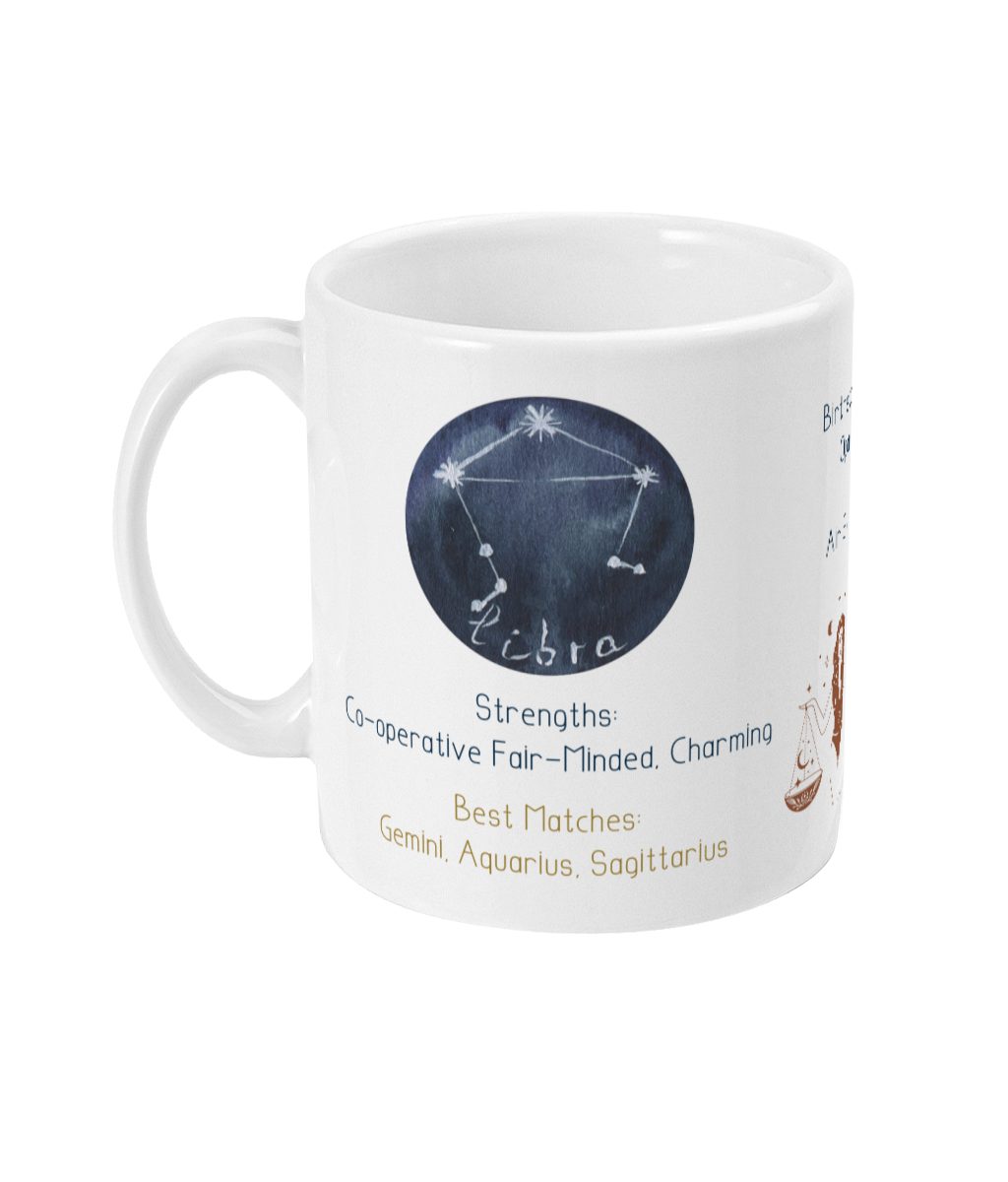 Indulge in celestial elegance with this Libra Zodiac Sign Astrology Mug. Crafted from high-quality ceramic and adorned with the Libra constellation, zodiac sign, lucky number 6, and charming personality traits like co-operative and fair-minded. This glossy white mug is a perfect gift for those born between 23 September and 22 October. Dishwasher and microwave safe, it symbolizes the balanced and peaceful essence of the Libra star sign.