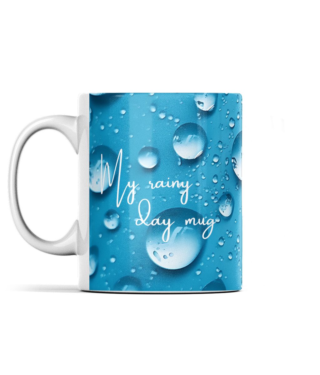 Brighten your day with our ‘My Rainy Day Mug’ – a cheerful ceramic companion adorned with raindrops on a calming blue backdrop.