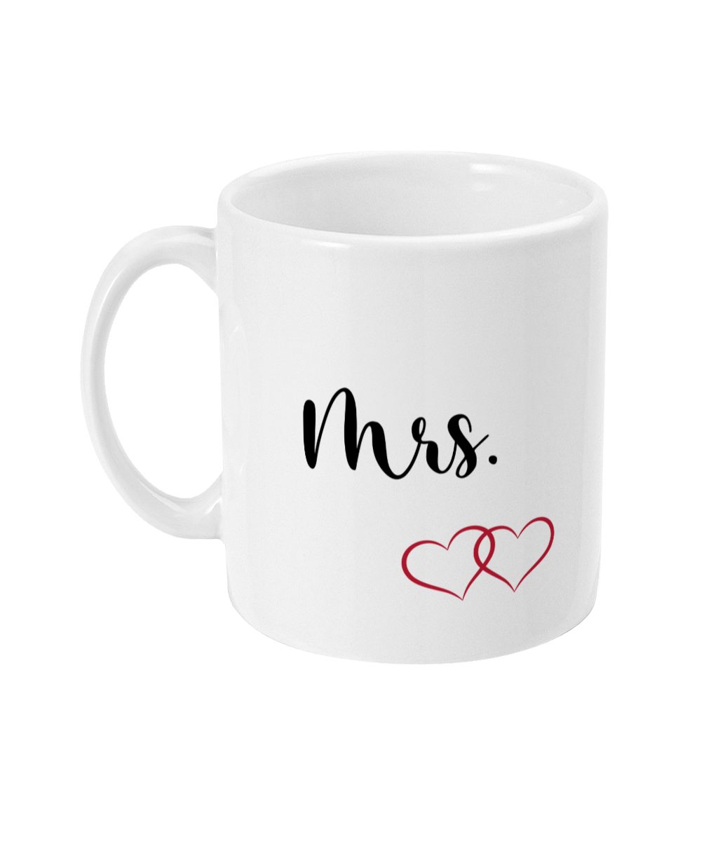 Indulge in morning bliss with our Interlocked Hearts Mrs. Mug! This charming 11oz ceramic mug boasts the title ‘Mrs.’ in a sophisticated cursive font, accompanied by two lovingly entwined hearts in black and red. Microwave and dishwasher safe, it’s a daily delight for any bride, showcasing her new status with every sip. Gift it solo or pair it with a Mr. Mug for the groom or another Mrs. Mug for a unique newlywed set. Celebrate love with every coffee break!