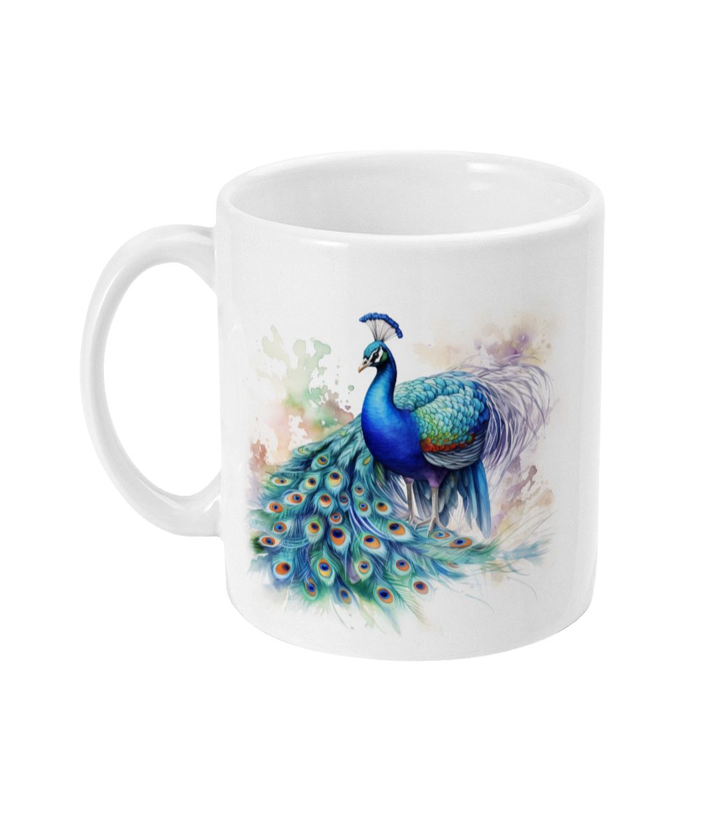 Experience serene elegance with our Peacock Majesty Mug, featuring a majestic peacock in soft watercolours. Sip in style!