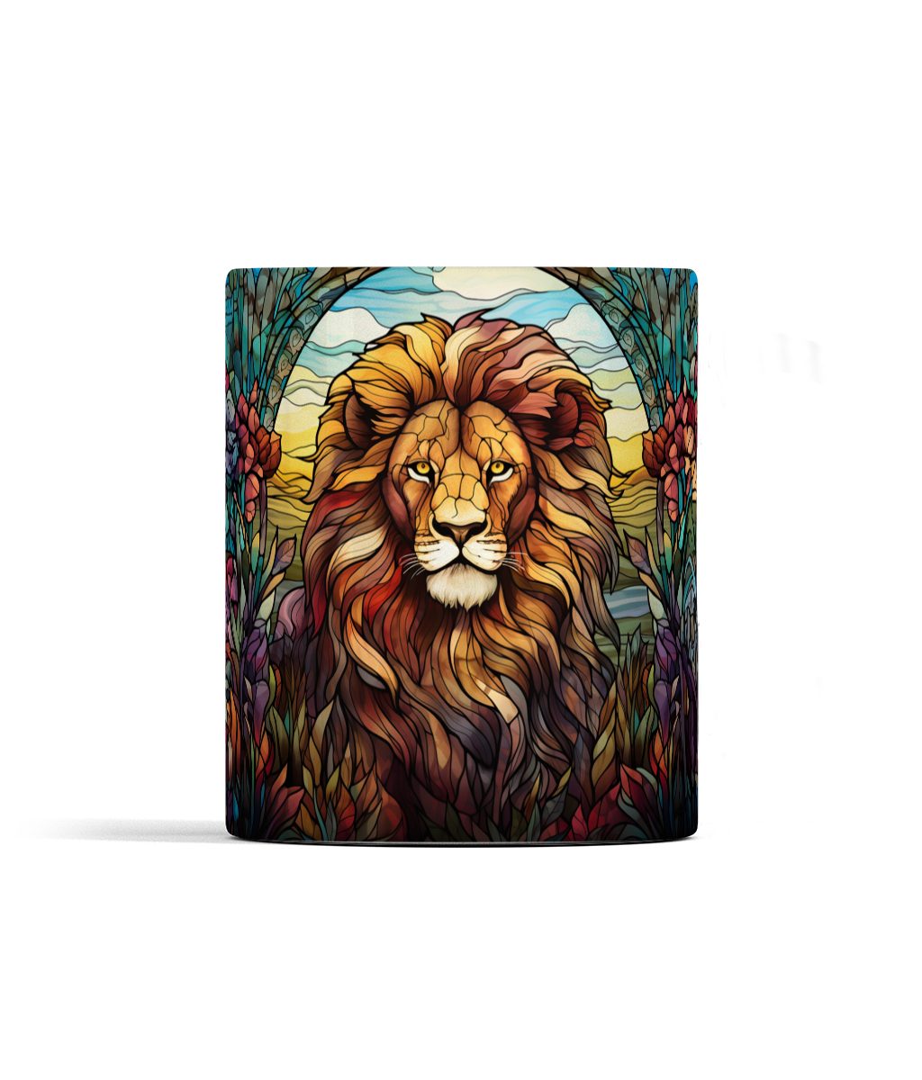 Elevate your daily ritual with our Royal Glass Lion Mug, showcasing a vividly colored lion’s face surrounded by intricate floral motifs resembling stained glass art. This ceramic mug embodies strength, courage, and regal inspiration, making it a perfect gift for anyone seeking empowerment and a touch of majesty in their day.